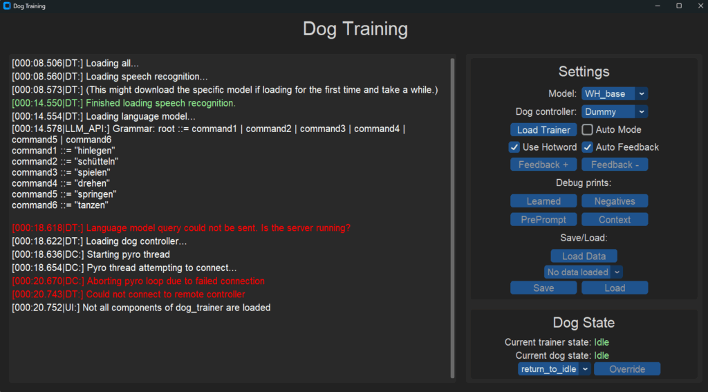 A training step goes likes this: – (optional: Hotword recognition “Hey Techie!” to await actual speaking intent) – Speech recognition with “Whisper” (Open-source Speech-to-text from OpenAI) – Check if command has confirmed matches – Check if command has a small Levenshtein distance to a confirmed command (like “sit” and “sat”) – Query the local LLM which command could be used – If the LLM fails or picks a confirmed negative, a random action is rolled from the remaining actions – The dog executes the picked action – The dog awaits Feedback: Listens to “Yes” & “Correct” for positive, and “No” & “Wrong” for the negative feedback – The picked Command + Action Combo is memorized – The Loop repeats